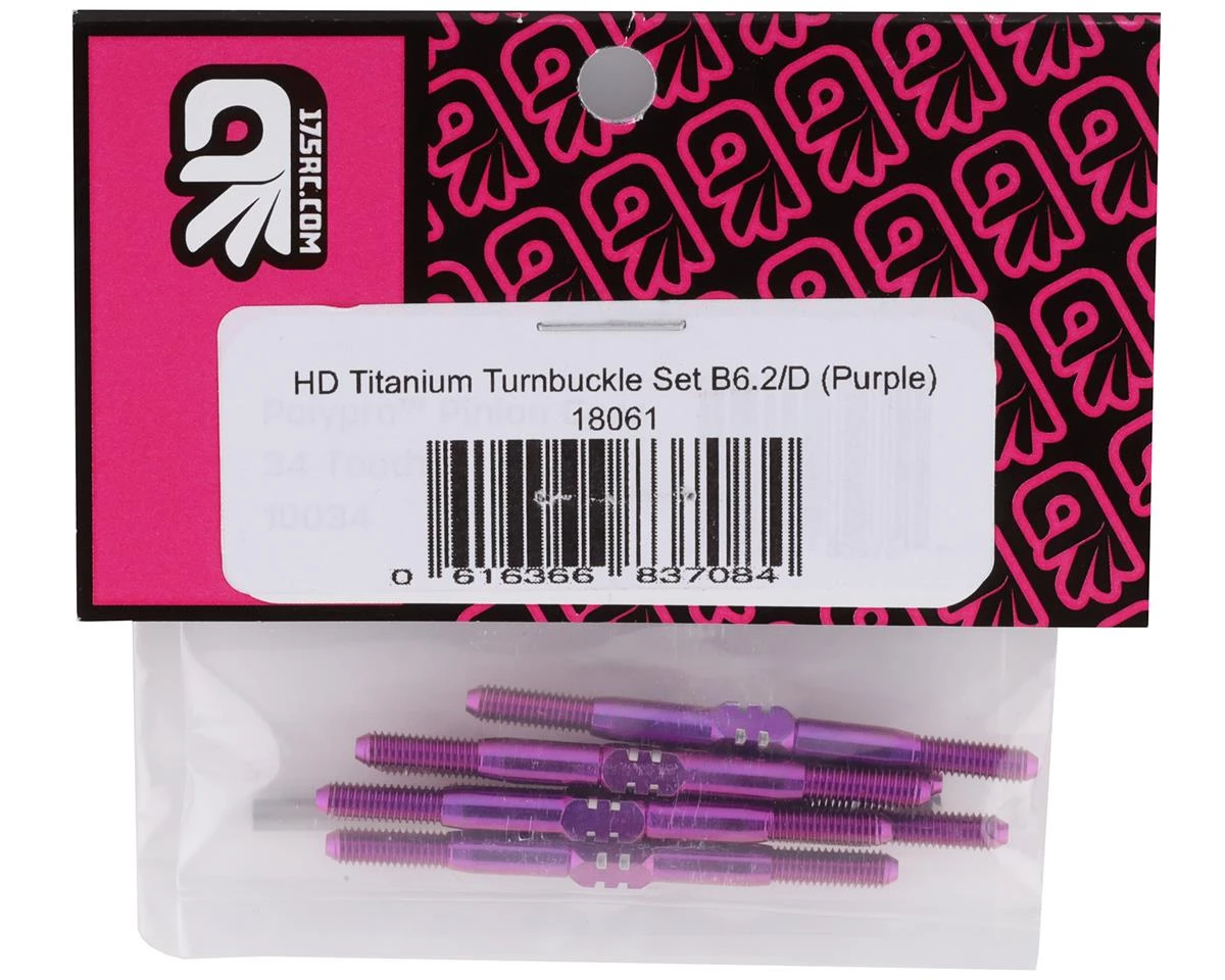 The 175RC B6.2/B6.2D HD Titanium Turnbuckle Set is an optional upgrade for the Team Associated RC10 B6.2 and B6.2D models. Titanium is stronger and lighter than the stock turnbuckles, and the turnbuckles are directional, allowing you to identify the direction that they should be installed.