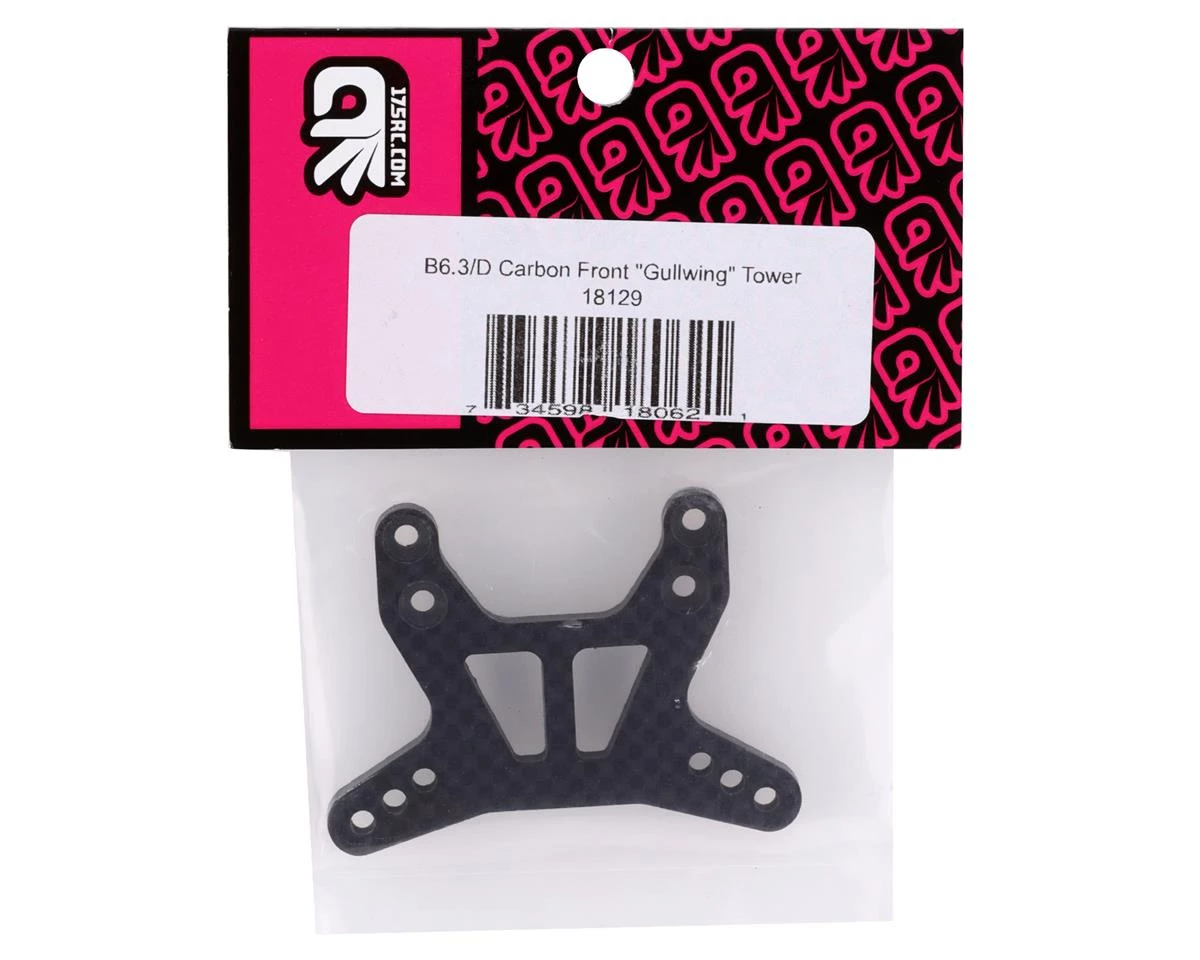 175RC B6.3/D Carbon Front “Gullwing” Shock Tower. This optional front shock tower is intended for the Team Associated B6.3 or B6.3D. Machined from 4mm carbon fiber to add killer looks and durability. Package includes one front shock tower.