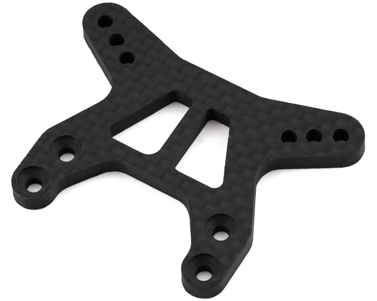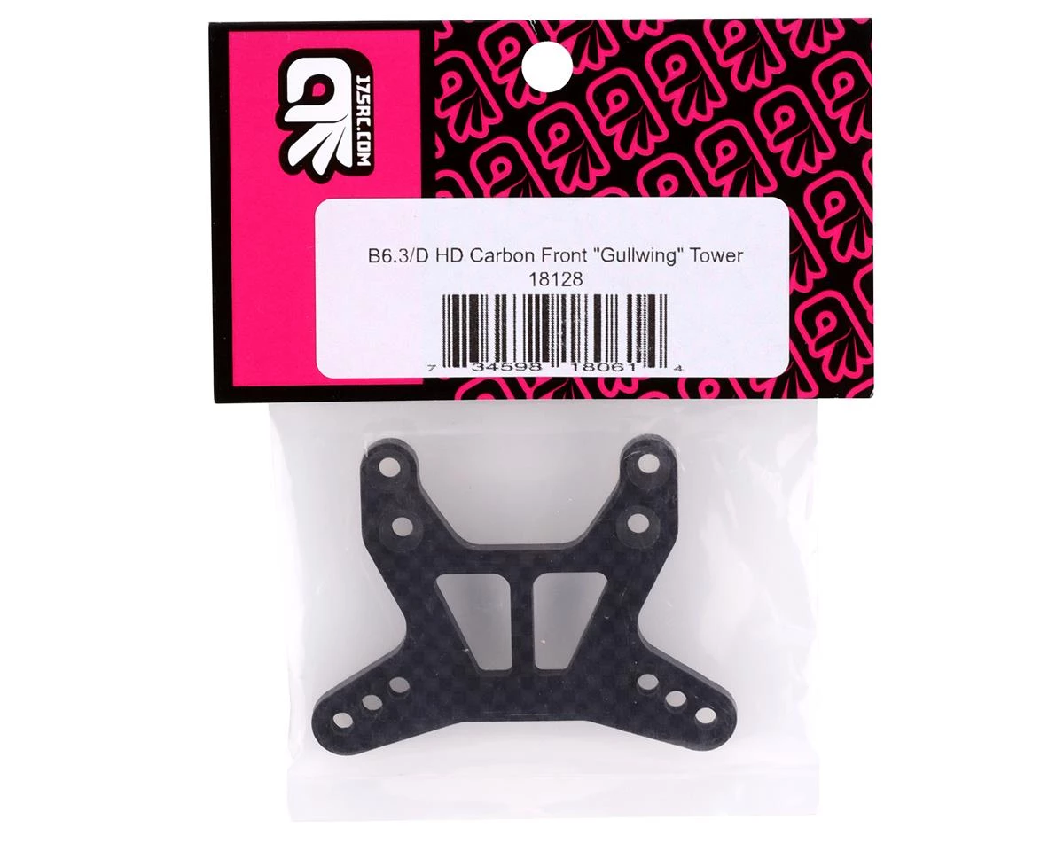 175RC B6.3/D HD Carbon Front “Gullwing” Shock Tower. This optional heavy duty shock tower is intended for the Team Associated B6.3 or B6.3D equipped with gullwing arms. Machined from 4mm thick carbon fiber and features more material above the shock mount holes when compared to the standard version (175-18129). Package includes one carbon front shock tower.