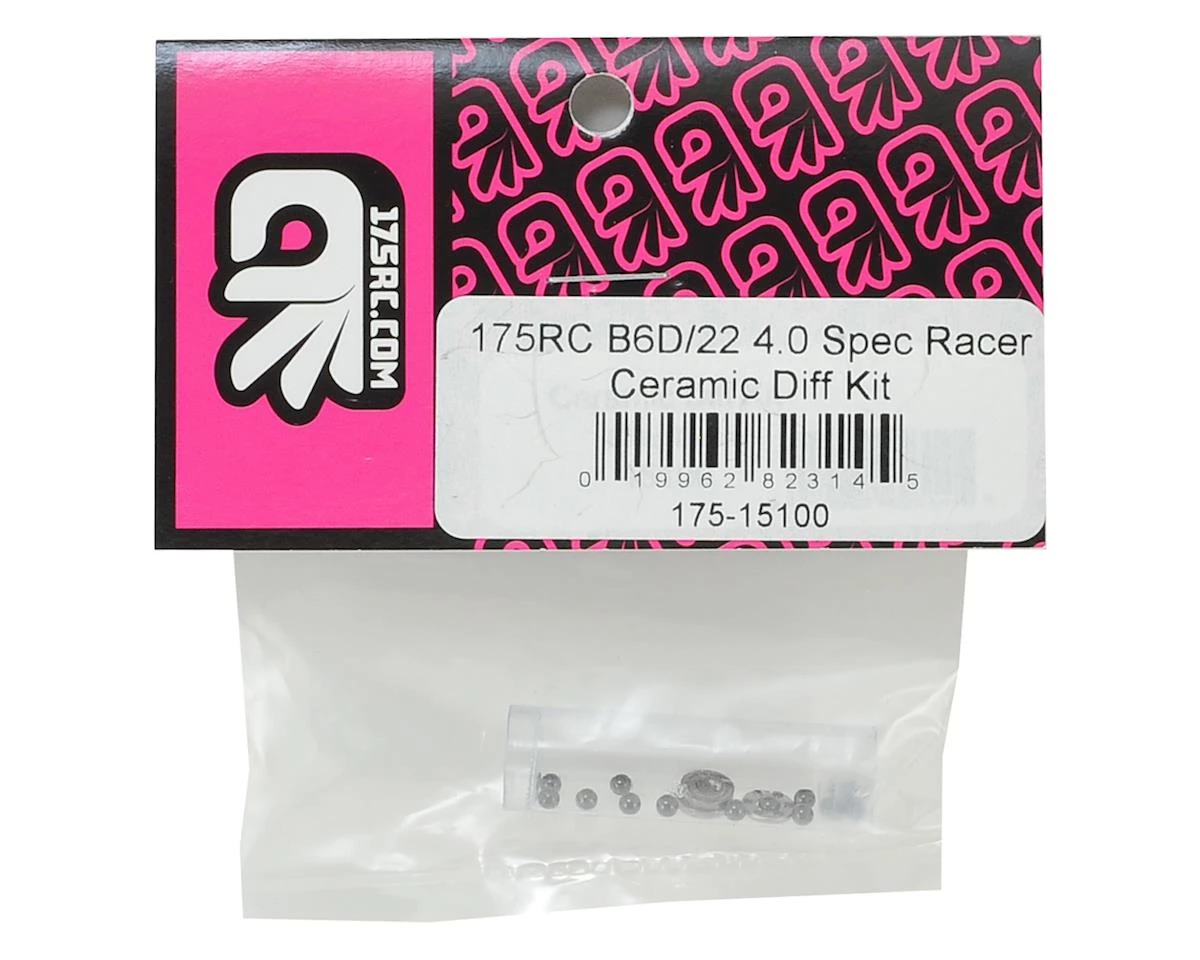 The 175RC B6D/22 4.0 Spec Racer Ceramic Differential Kit is perfect for stock racers. The Lightweight Ceramic diff balls and lightweight ceramic caged thrust bearing weigh in at .6 grams compared to 2 grams for stock carbide setup. Reducing the rotating mass increases punch and overall power delivery. Ceramic balls offer the smoothest diff possible. This diff kit will work in most popular 2wd vehicles. Some of these models are AE B6D, TLR 22 4.0, Kyosho RB6.6, Yokomo YZ2 and many more.