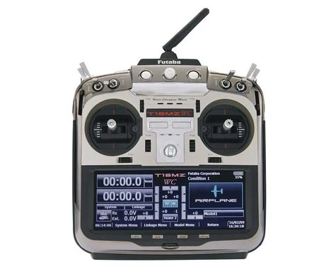 This is the Futaba 18MZH WC World Champion Model 2.4GHz Computer Radio System on Mode 2 with the R7008SB Receiver. **Does Not Include Servos** Designed in collaboration with Christophe Paysant Le-Roux who used a Futaba 18MZ Radio to win the 2015 F3A World Championships. This is the helicopter version which will default to helicopter settings when powered up. Transmitting Frequency: 2.4GHz Power Supply: 7.4V LT2F3500 LiPo battery Current Drain: 1 ampere maximum (RF power on and back light on) 700mA average COMMENTS: Optional multiple telemetry sensors are available; RPM (magnetic and optical) Temperature, Voltage, Altitude, GPS and Fuel Level jxs 03/28/16 ir/jxs