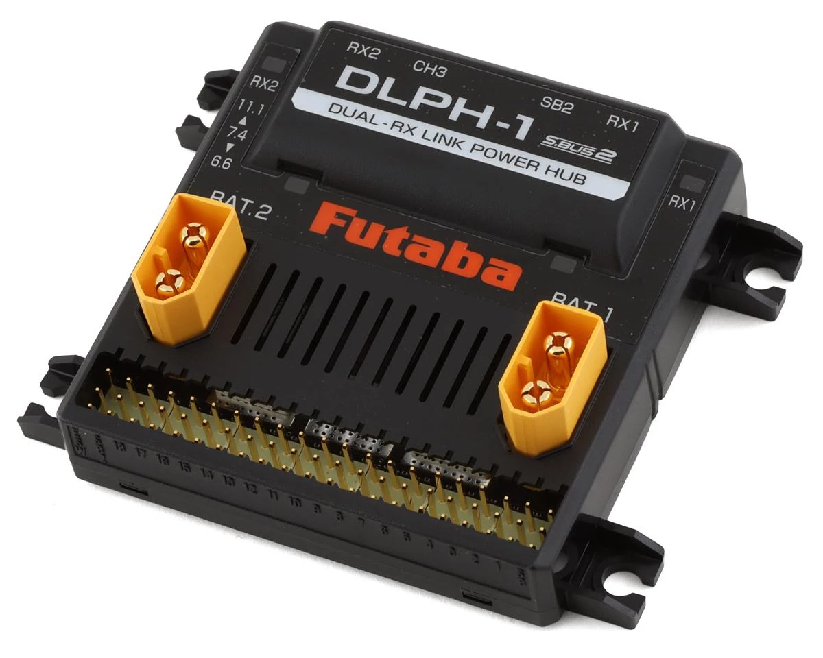 The Futaba DLPH-1 DL Power Hub is a great option for those needing to manage multiple high output servos for larger aircraft. This hub features dual ports for receivers as well as for batteries. Using this system will allow you to connect up to eighteen high performance servos can be PWM connected. Package includes one DLPH-1 power link, one switch, two receiver extensions, one mini screwdriver and hardware.