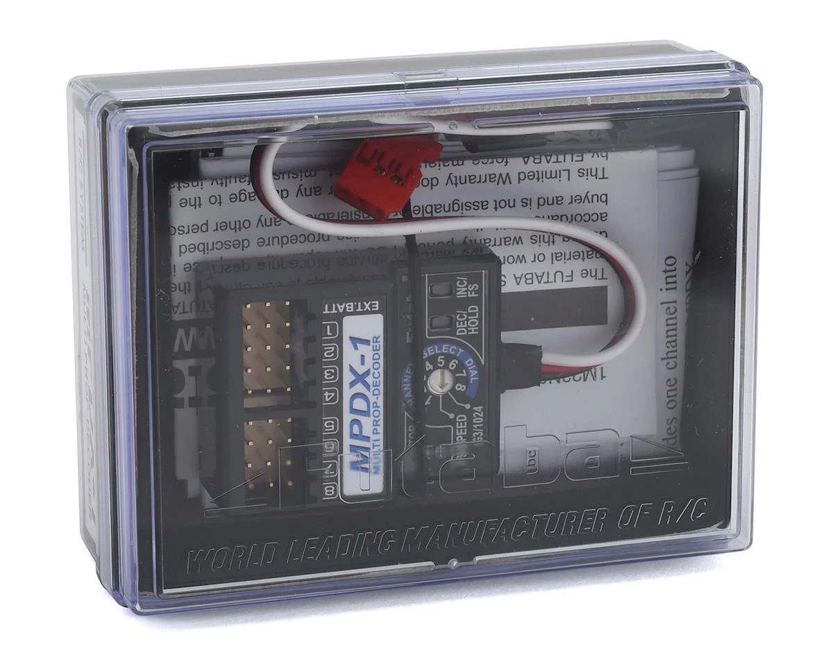 The Futaba MPDX-1 Multi-Prop Decoder is used to expand a single receiver channel signal, to up to eight channels. Simply connect the decoder to the receiver on Futaba 32MZ, 18MZ, 14MZ, FX-40, 12Z and 12FG systems.