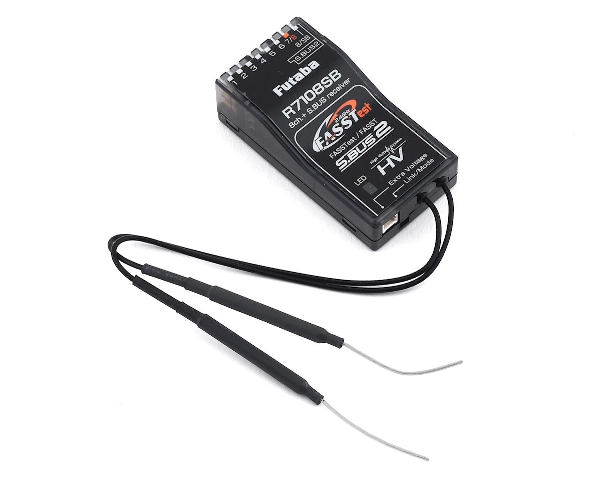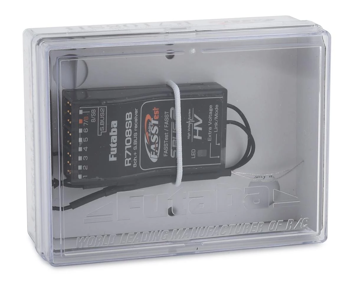 This is the Futaba R7108SB 2.4GHz FASSTest 8+ Channel High-Voltage Receiver for the 32MZ, 18MZ, 18SZ, 16SZ and 14SGRadio System. The 7108 receiver features SBUS and SBUS2 and when used with the Smart Bus SRS system will provide up to 18 input channels with full SBU2 telemetry support for battery monitoring of voltage, current and mAH.