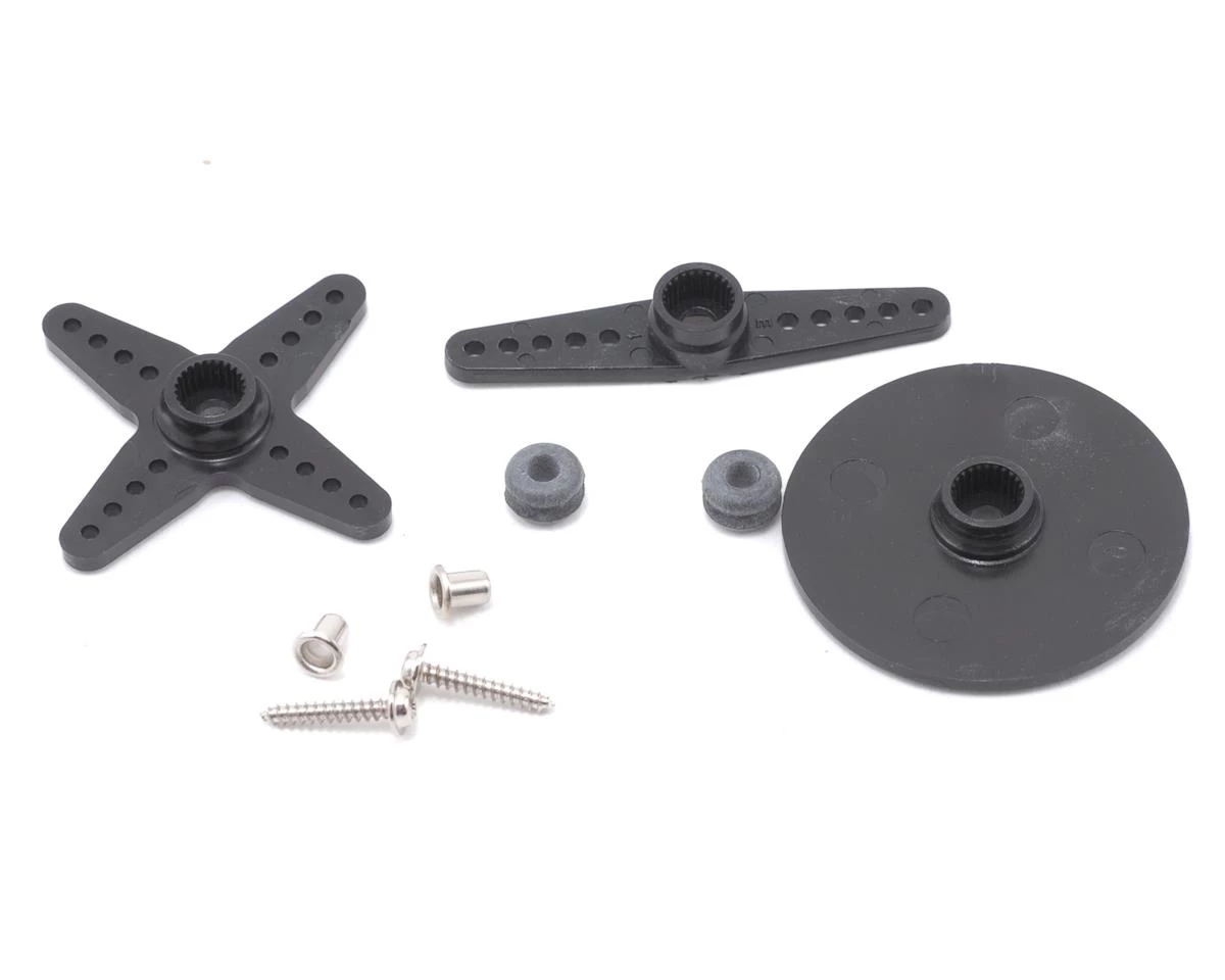One S3150 Wing Aileron Digital Servo, one 1″ (25mm) star shaped horn, one 1.5mm (39mm) star shaped horn, one 1.8″ (45mm) straight arm, one 1.4″ (35mm) diameter horn, two each-screws, eyelets, and grommets