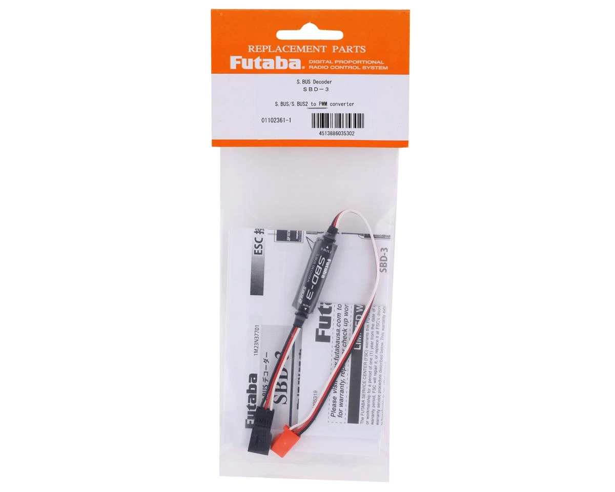 Futaba SBD-3 S.Bus Decoder. This optional decoder is great for those using a conventional servo/ESC with an S.Bus system. The SBD-3 may be used with S.Bus and S.Bus2. Package includes one decoder.